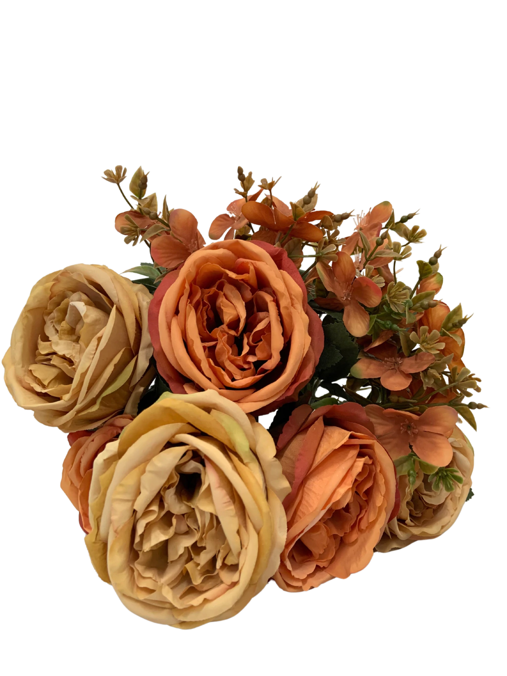 Buquê de rosas, mesclado em tons de TERRACOTA. Acompanha 6 botões maiores, mini hortênsias e folhagens. Medindo 30 cm de largura e 40 cm de altura. feito de arame. plástico e tecido